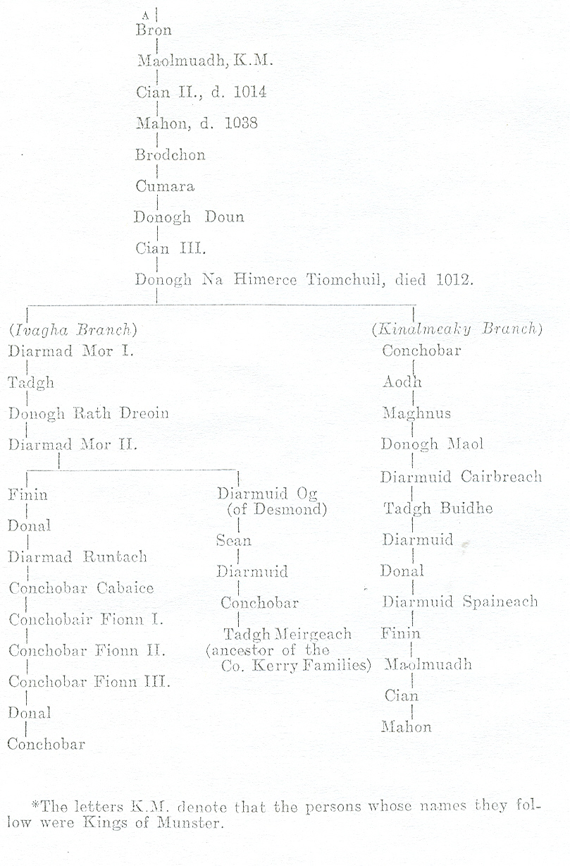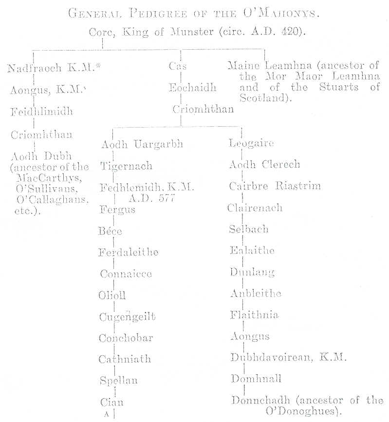 With this paper we give a general pedigree of the O'Mahonys, from which it will be seen that Eochaidh, whom we have just mentioned, the son of Cas, had a son Criomhthan, who was father of (1) Aodh called Uargarbh (the overhearing) the ancestor of the Mahonys, who from him were called the "Cinel Aodha," and of (2) Leogaire the ancestor of the O'Donoghues, who were called the "Cinel Laegere." Of course "Ui Eachach" was the general name of two cognate septs.